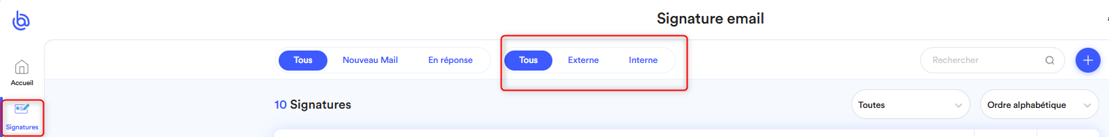 Vous accédez à cette distinction dans le menu "Signatures" en déplaçant le curseur "Interne"/"Externe" " disponible en haut de la page.