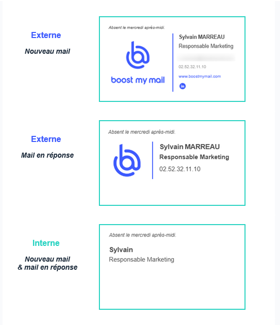 Une signature est considérée comme "interne" lorsque le mail est adressé à une ou plusieurs personnes dont le domaine mail est le même que le votre.